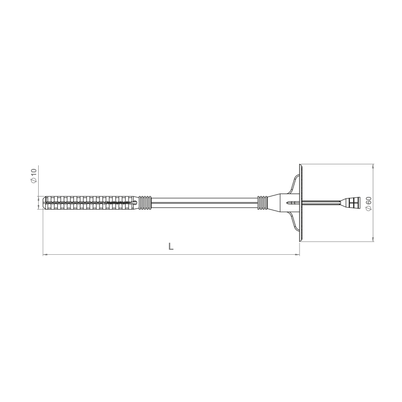 180 mm long insulation anchor with polyamide plug and extended expansion zone – Ø10 mm, Ø60 mm pressure plate.