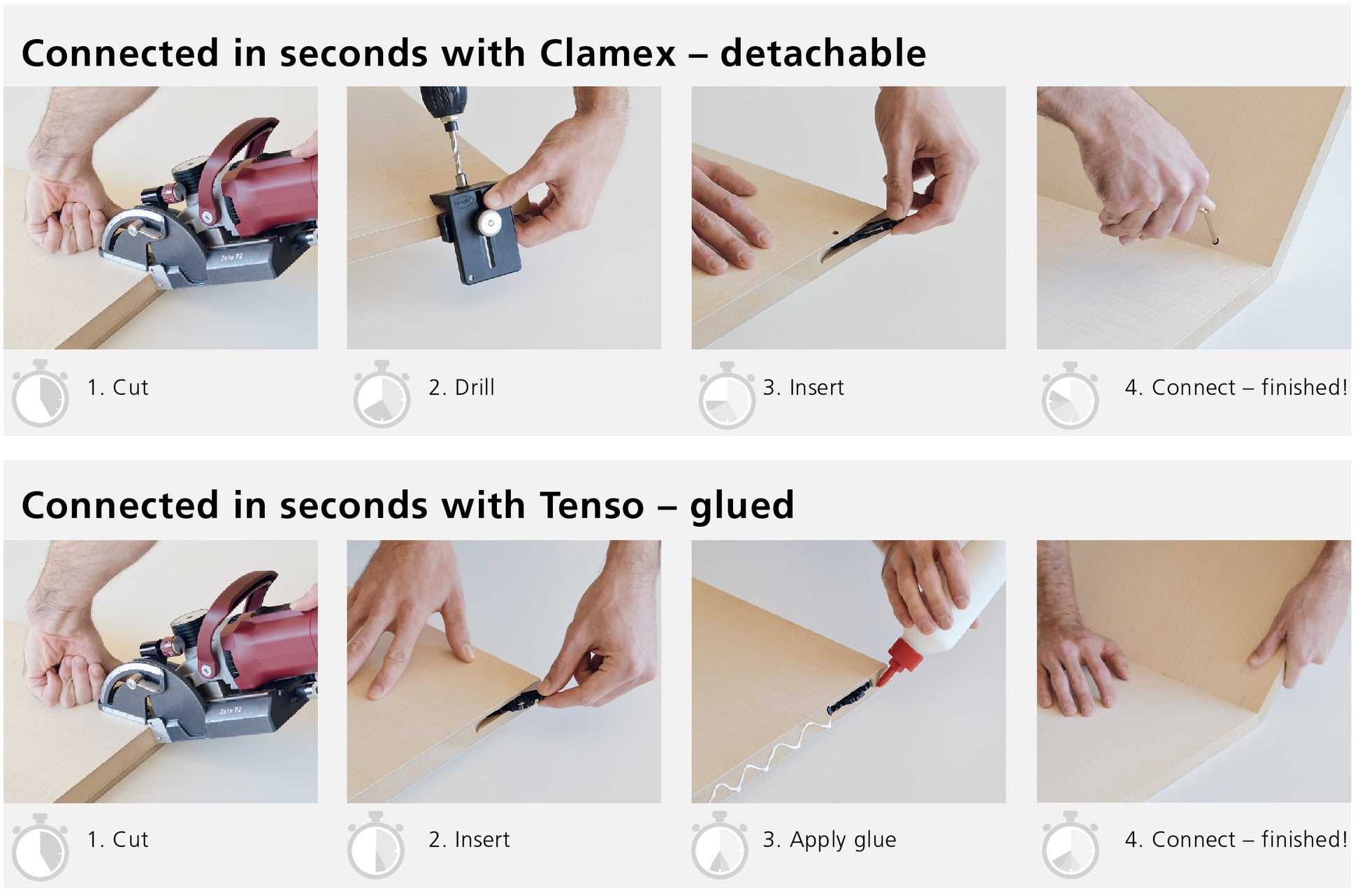 Zeta P2 - a strong fixing/fastening device for all P-System connecting parts for wooden joints. Automatic vertical movement creates a profile groove, allowing the connecting parts to be inserted manually. Angular connection with two Clamex P connections in less than 2 minutes!