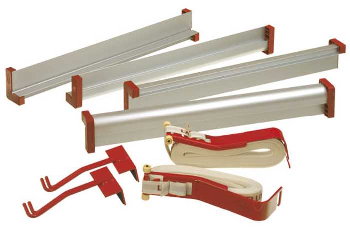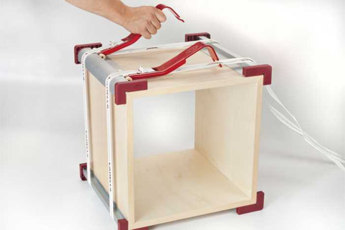 The clamping set is a system for gluing cabinets and various other components in furniture manufacturing and is an addition to the Lamello system. The clamping kit consists of profile sections for edge protection, an 8-meter long strap with tensioners, and two tensioning hooks. Unlike screw clamps, the pressure distribution is always uniform, which means that the furniture is automatically secured at a right angle, regardless of whether the panels are glued in a flat or angled joint. The fastening kit is ideally suited for drawers, cabinets, frames, or wall and floor panels.