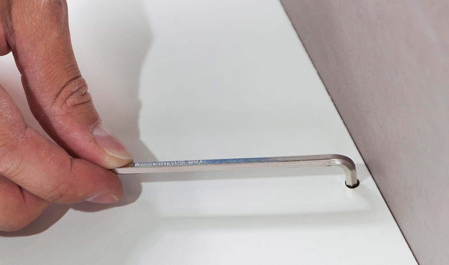 Clamex P-14 Flexus is an easy-to-install and removable connector that is secured in the P-System milling profile within seconds. Through the minimalist 6 mm access hole, Clamex P-14 Flexus can be tightly connected and disconnected using a hexagonal release mechanism. The flexible fasteners allow for easier connections in hard-to-reach areas, thanks to the unique design of the connector, which consists of two differently sized components.