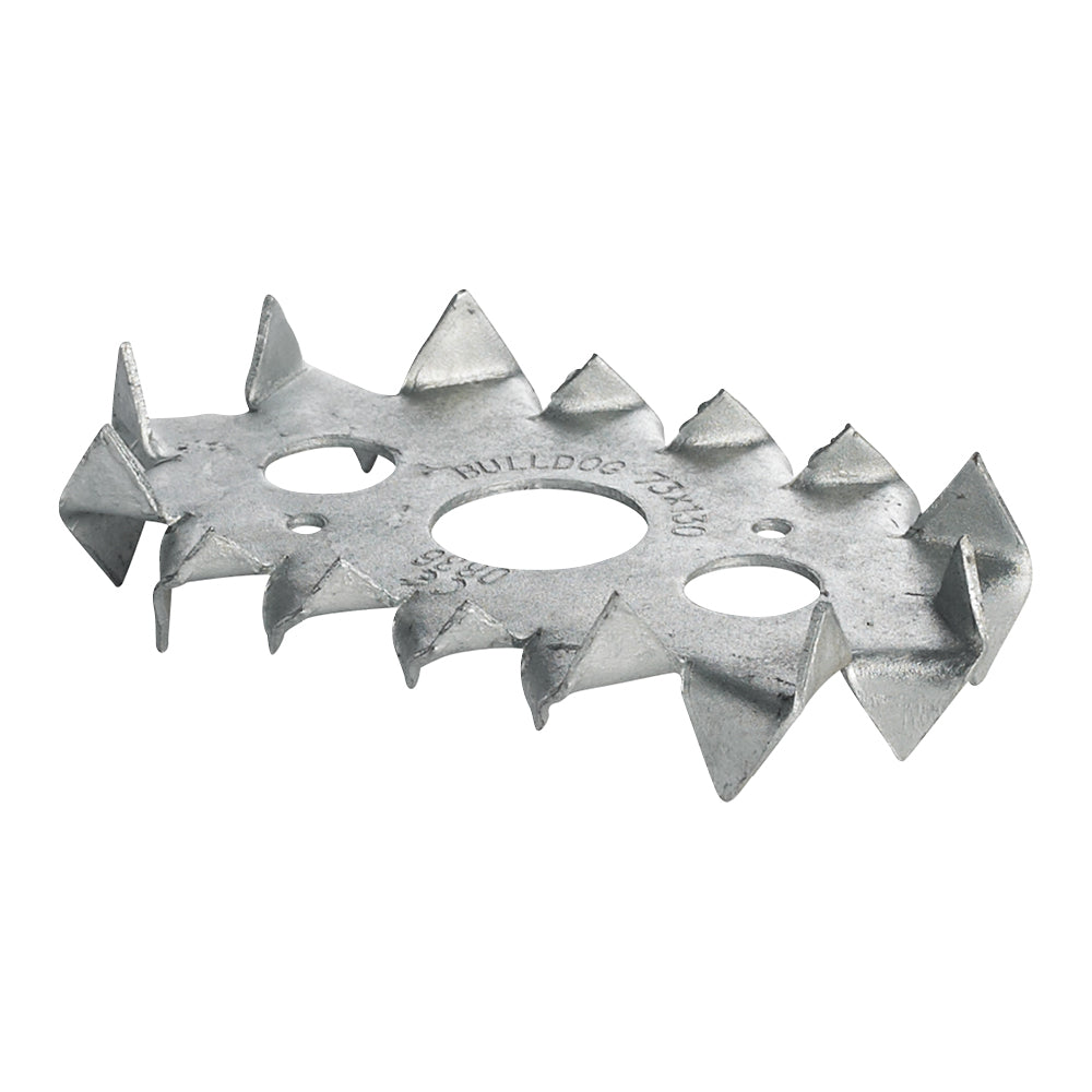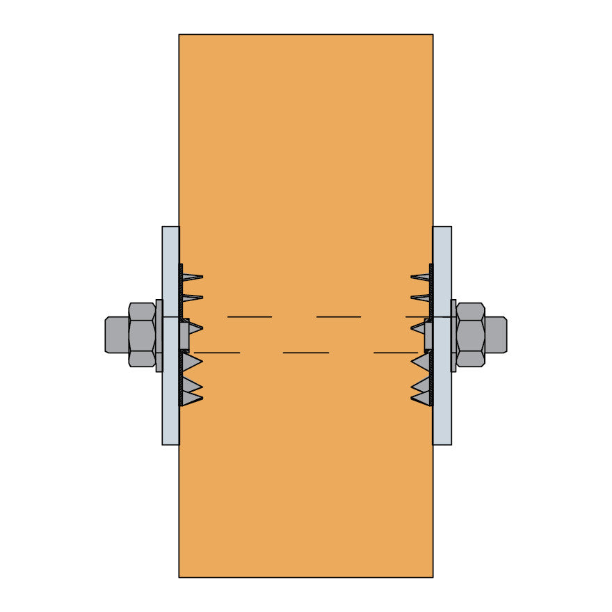 Galvanized steel anchor plate used to connect two wooden materials with a dowel.