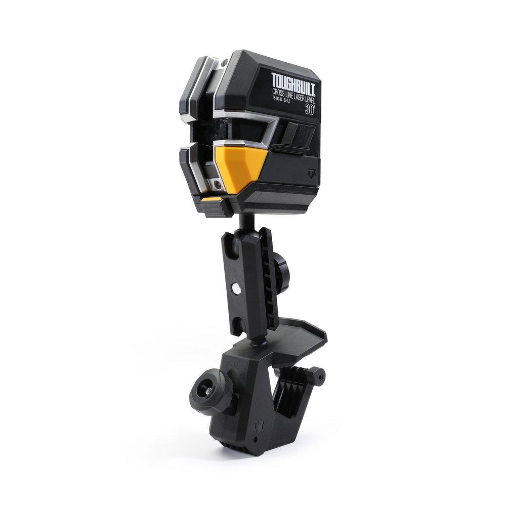 The "ToughBuilt" 30m cross line laser level displays a bright horizontal and vertical line, designed for various leveling and layout tasks.
