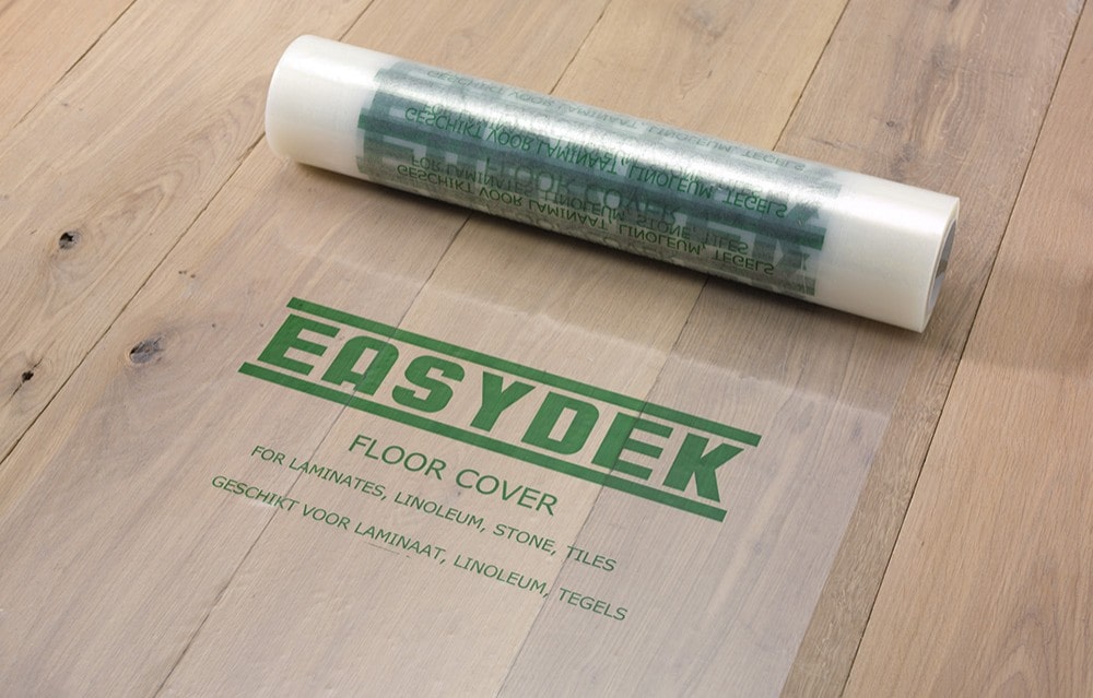"Easydek Floor Cover" is an extremely strong, gently adhering protective film, designed for temporary protection of floors and stairs. The transparent LLDPE film has a specially designed water-based adhesive coating to optimally adhere to hard surfaces.