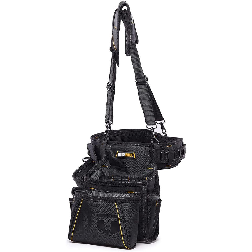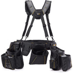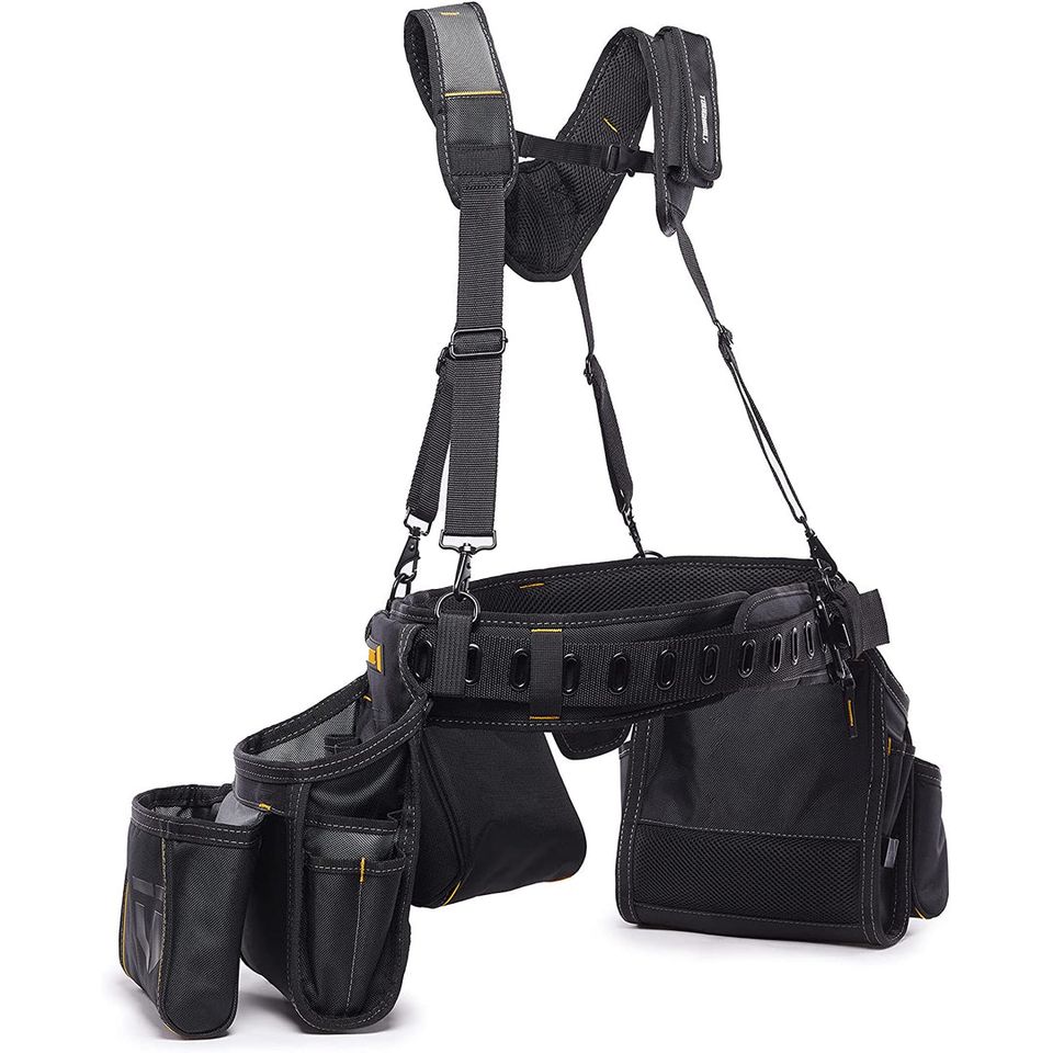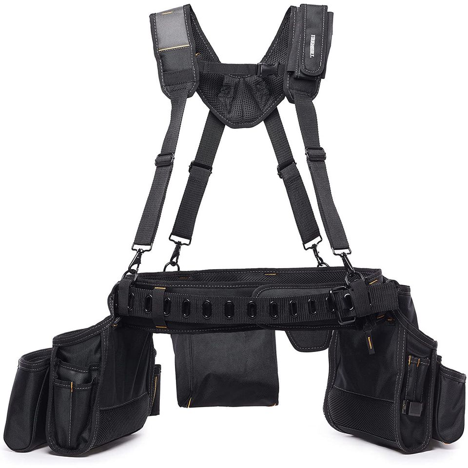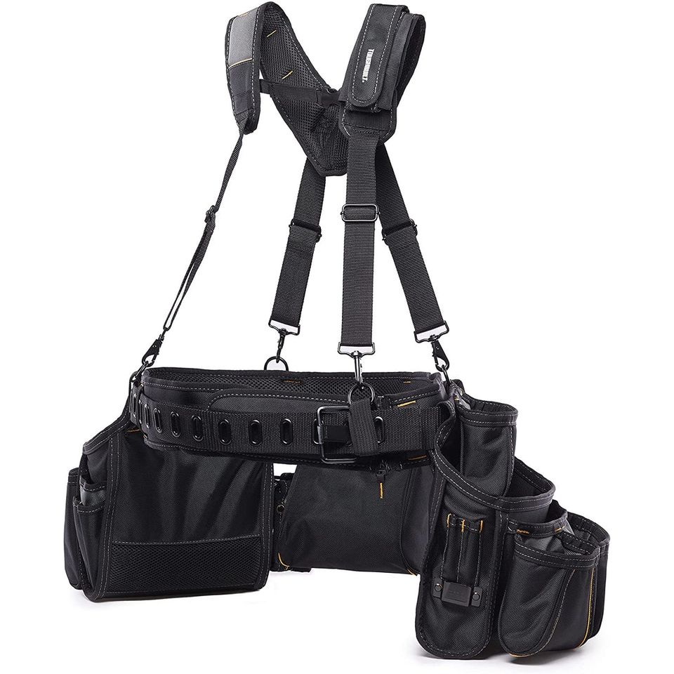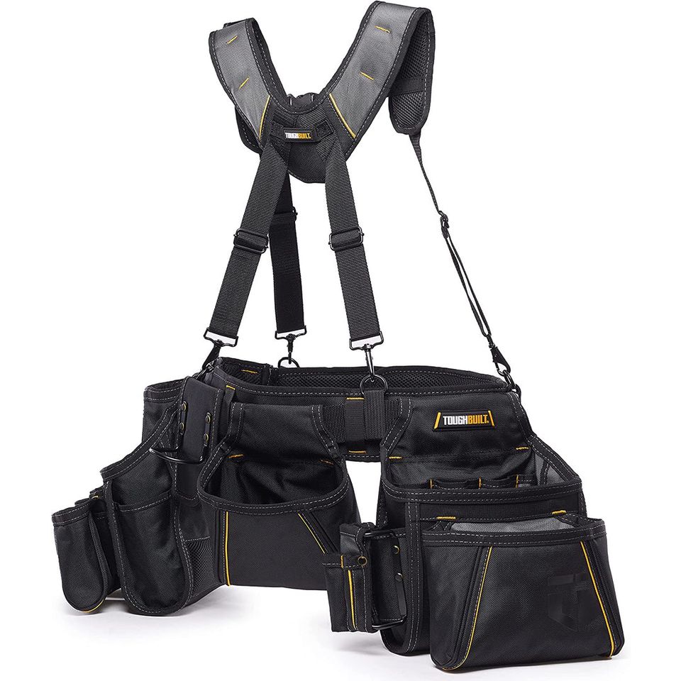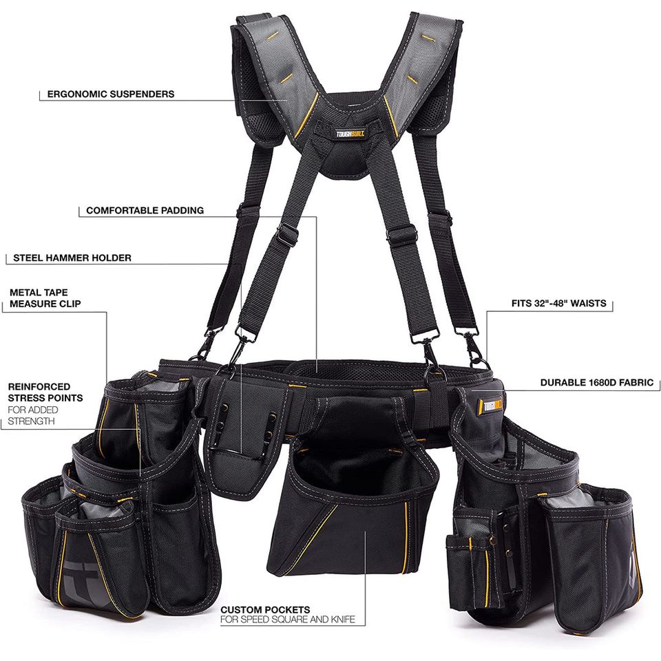 The "Toughbuilt TB-301-6 Pro Framer Suspension Rig" is a professional standard device designed to evenly distribute the weight of heavy loads. The padded shoulder straps are ergonomically designed to match the natural curvature of the shoulder, thus avoiding hot spots and making work safer and more comfortable. The pocket linings of the pouches are plastic, so they maintain their shape and do not crumple, preventing tools from falling out and ensuring easy access to them. The padded belt is fully adjustable to fit larger and smaller waists. The padded extension easily conforms to a larger waist, and for a smaller waist, it can be unzipped. The belt has a double ring hammer holder. Ideal for professional users.