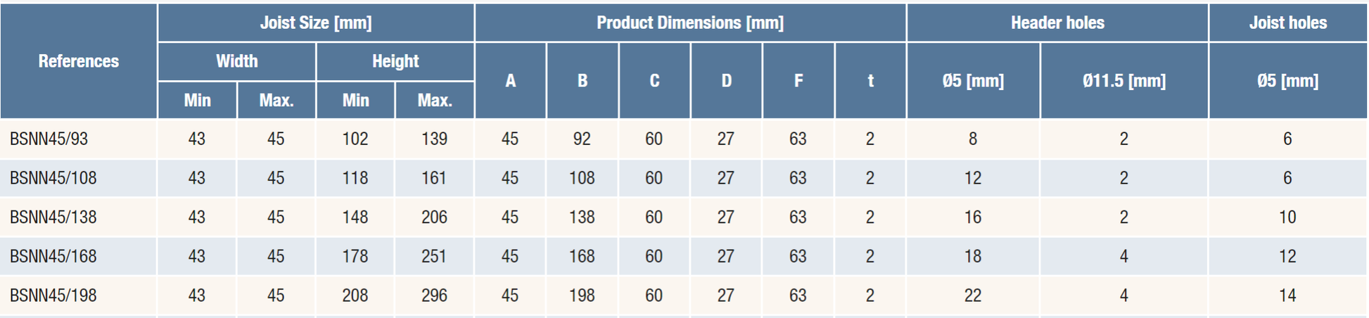 Product description and full specifications on the manufacturer's website: Face Fix Hangers - BSNN | Simpson Strong-Tie (strongtie.lv)