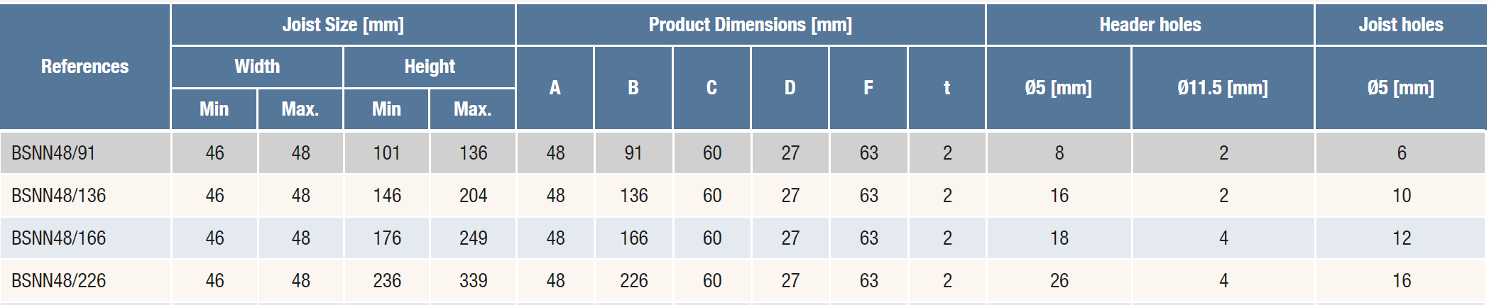 Product description and full specifications on the manufacturer's website: Face Fix Hangers - BSNN | Simpson Strong-Tie (strongtie.lv)