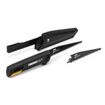 The saw features an ergonomic handle that provides a secure grip and comfort during extended work periods. The included sheath with a metal blade guard allows for convenient attachment to a tool belt while protecting both the tool and the user.
