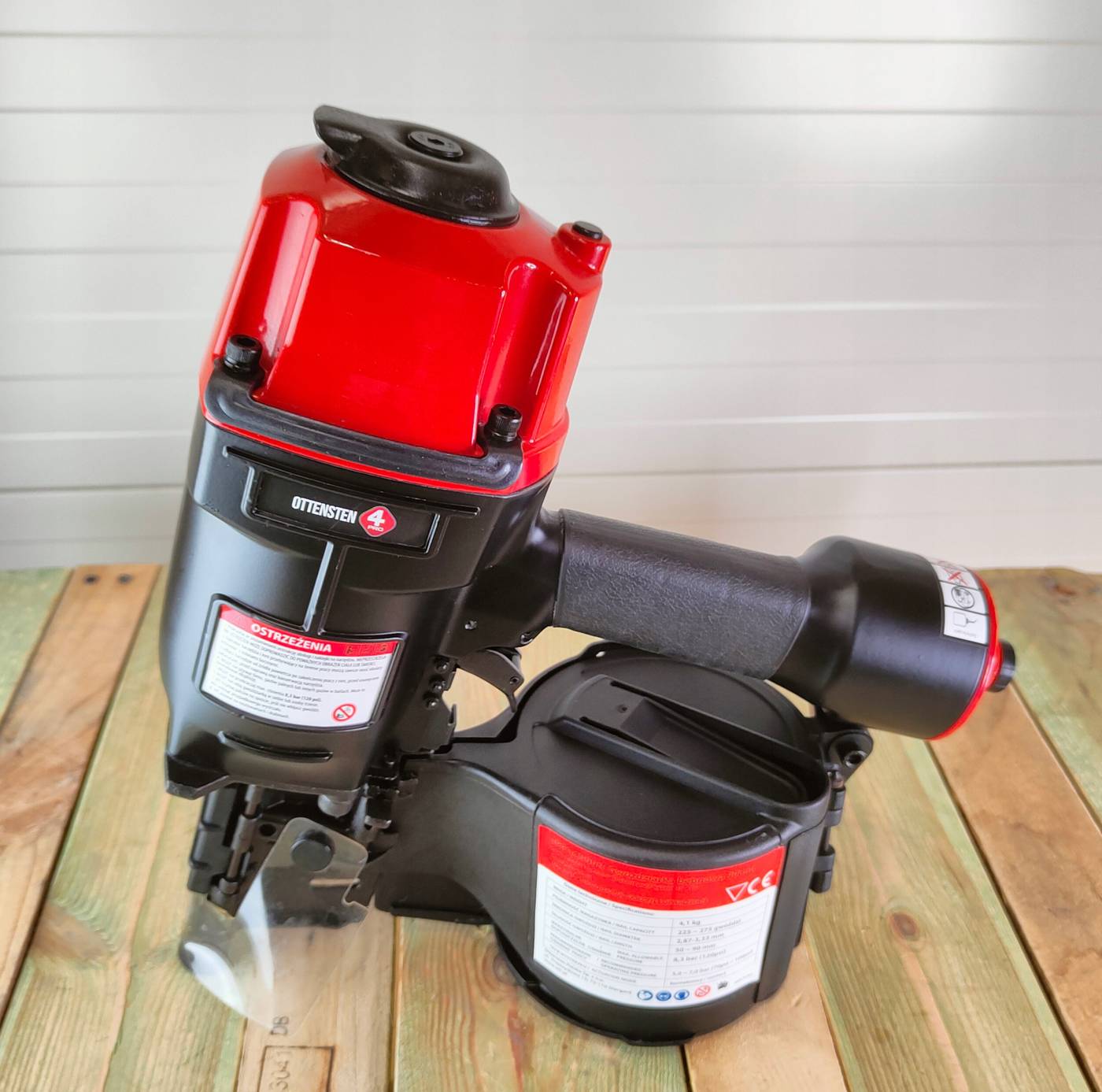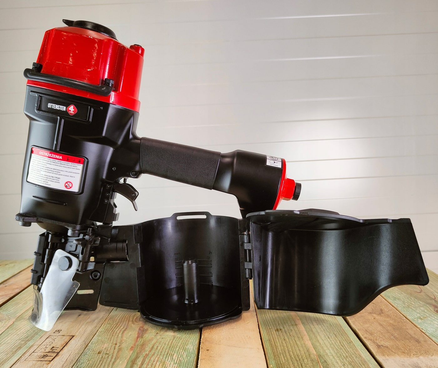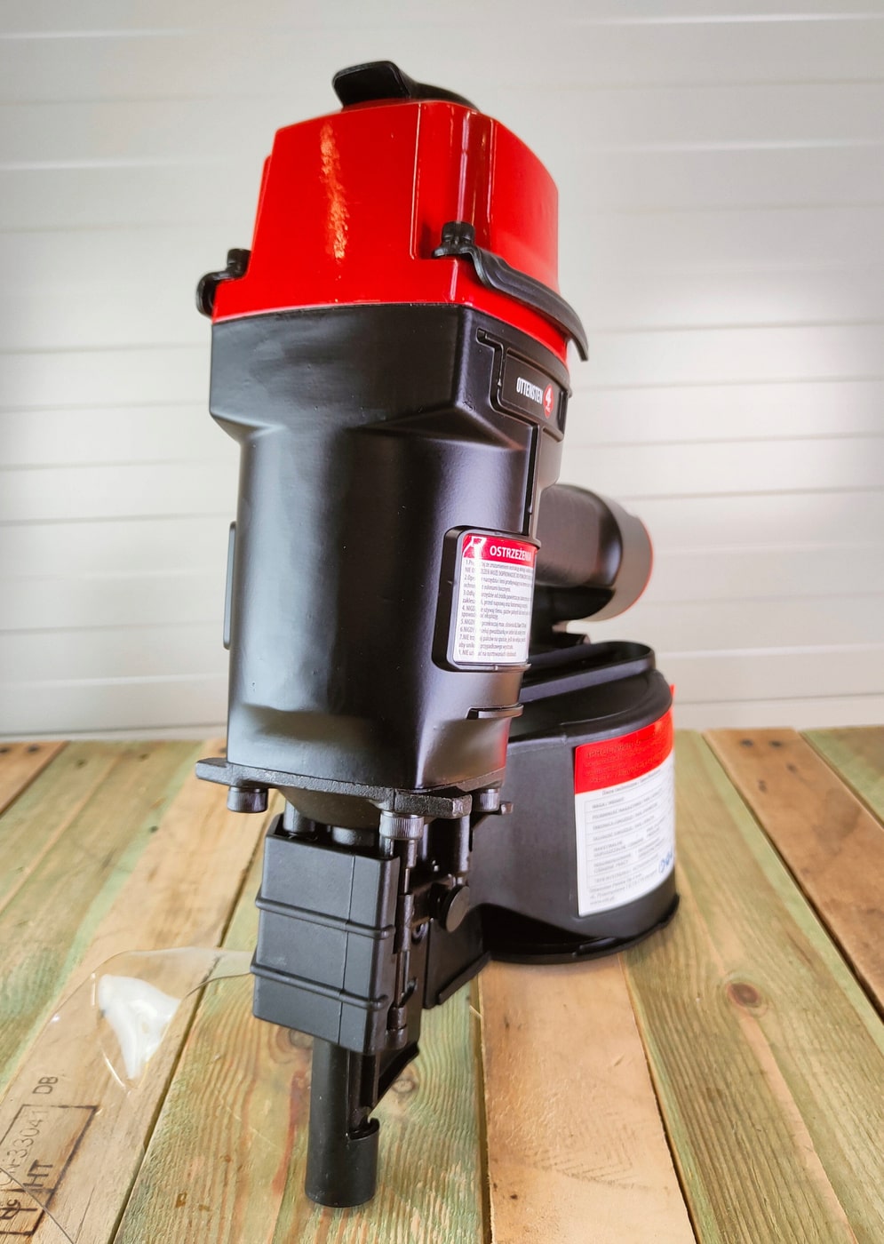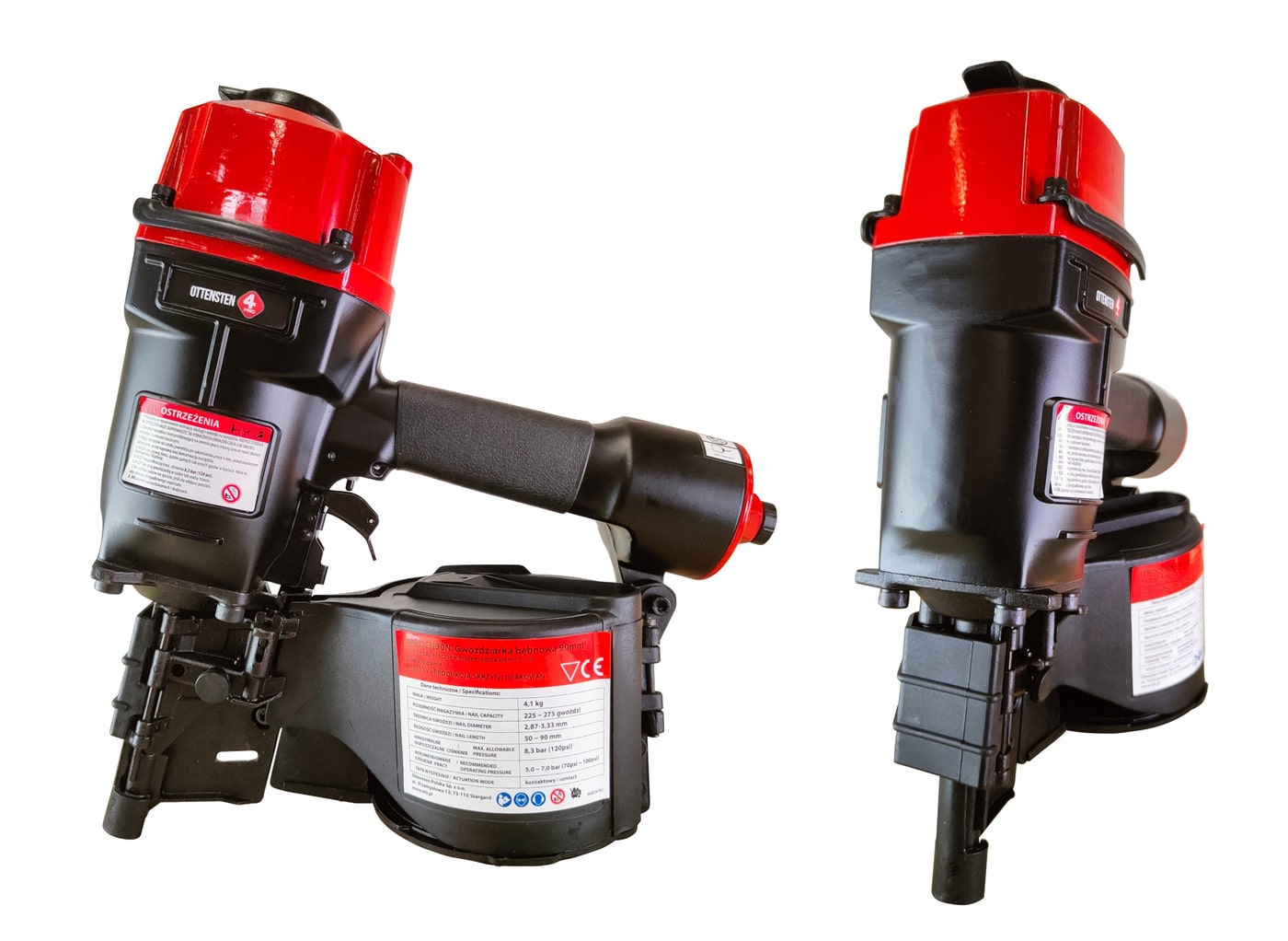 This is a completely professional tool, characterized as very durable and powerful. The pneumatic drum nailer CN90 uses wire-connected nails: flat, corrugated, and threaded. Tested in companies producing wooden pallets, wooden packaging, and wooden garden products. The rapid-fire (up to 3 shots per second) and low mass tool allows for great maneuverability and flexibility in work, while protecting the bone and muscle system from overloads, which is the cause of many injuries and bone and muscle system disorders. The nailer responds quickly and accurately to the release mechanism, the standard high-capacity and easily loaded magazine, the rubber handle provides comfort for the job.