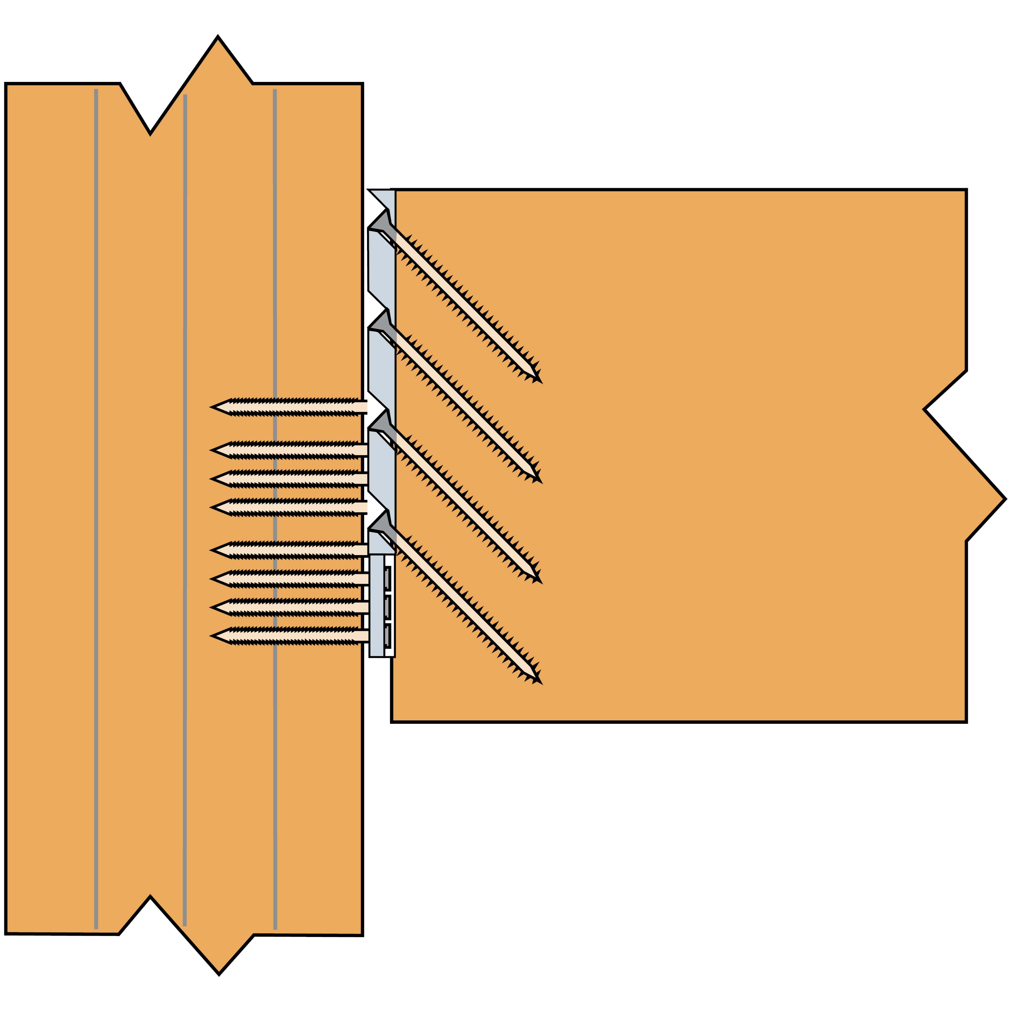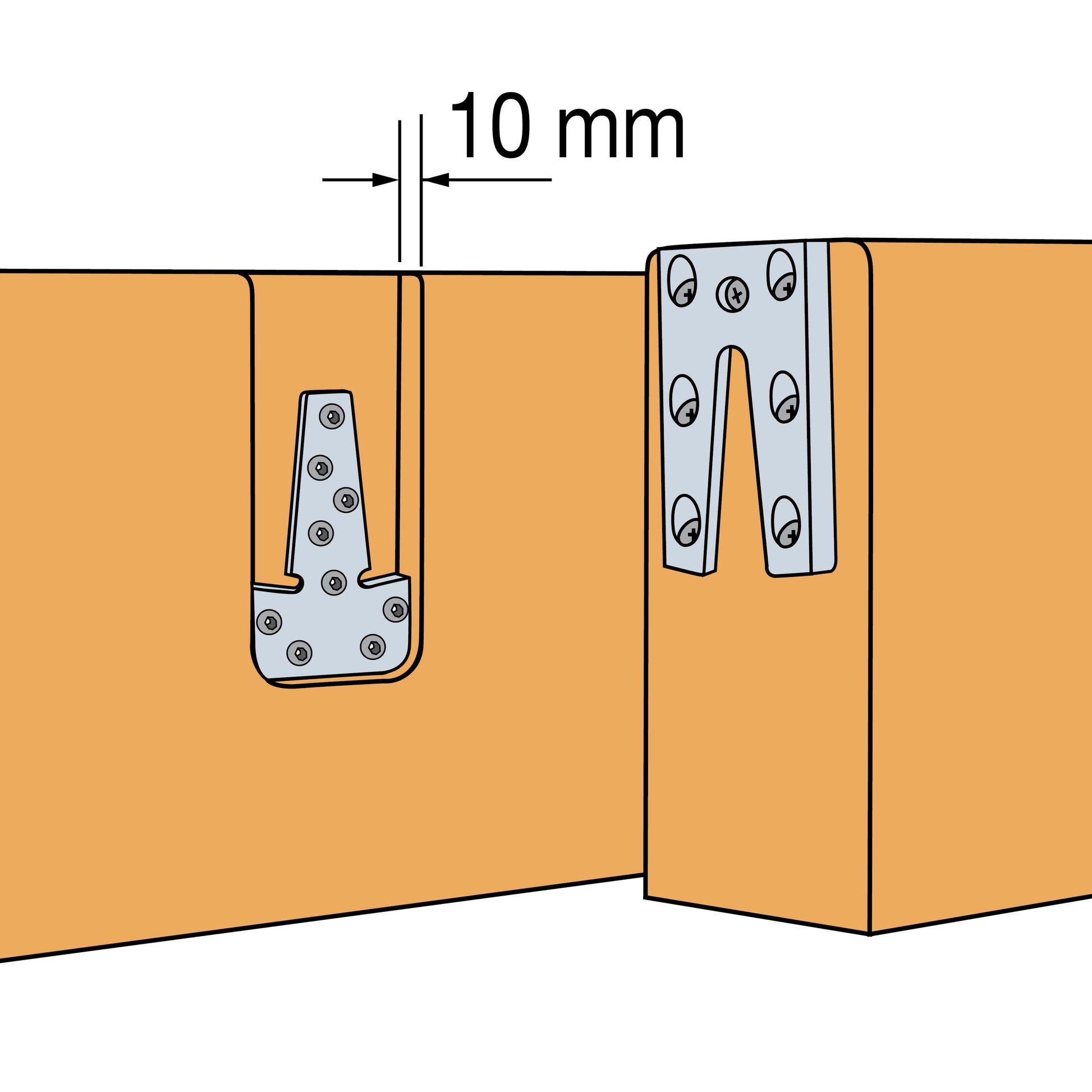 The hidden ETB connector consists of two parts. The first part is inserted into the main structure and secured with screws, while the second part is attached to the end of the beam with bolts.